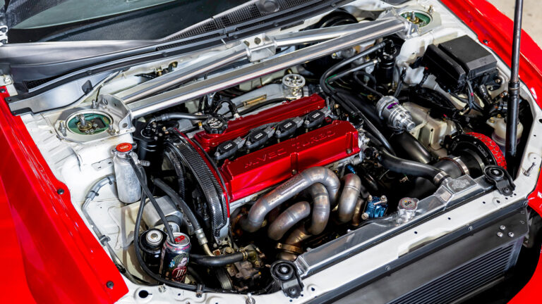 Engine: 2.0L four-cylinder 16v with HKS 2.3L Stroker Kit, HKS 274˚ camshafts, HKS GT6290 ball-bearing turbo, HKS racing blow-off valve and direct ignition, HKS intercooler and spark plugs, Supertech valvetrain, ARP 625+ head studs, Radium fuel rail, single-pump surge tank and fuel pump hanger, Injector Dynamics 1700cc injectors, MoTeC M150 ECU, Hypertune intake manifold, race-spec exhaust manifold, CSF oil cooler and radiator, AntiGravity AG-35-RS lithium battery