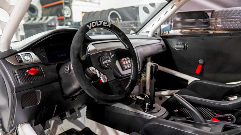 Interior: six-point Time Attack-spec rollcage, MoTeC C127 dash, 15-position keypad and power distribution module, Bride Voltex ZETA IV carbon fiber seats, Voltex x Nardi steering wheel, Works Bell short hub and Racing GTC flip-up adapter, IRP short shifter